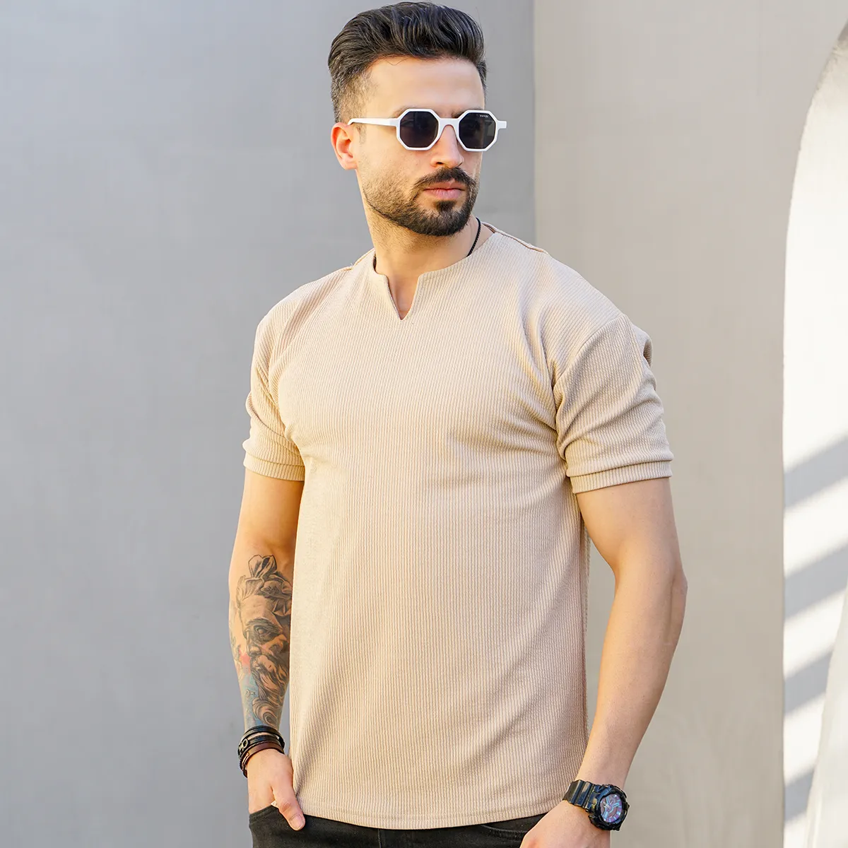 تیشرت آستین کوتاه یقه کوبایی کرم مردانه مدل Asam
