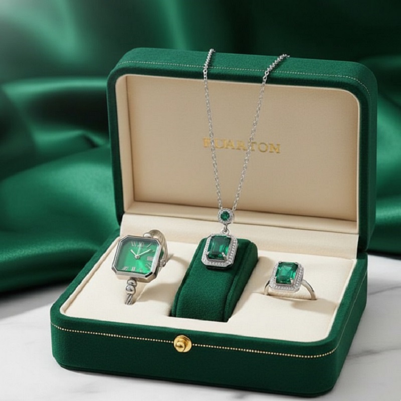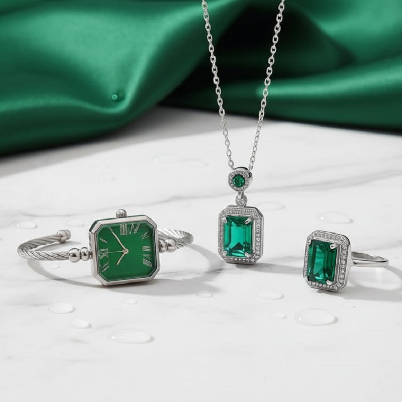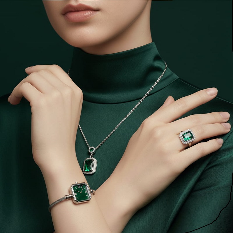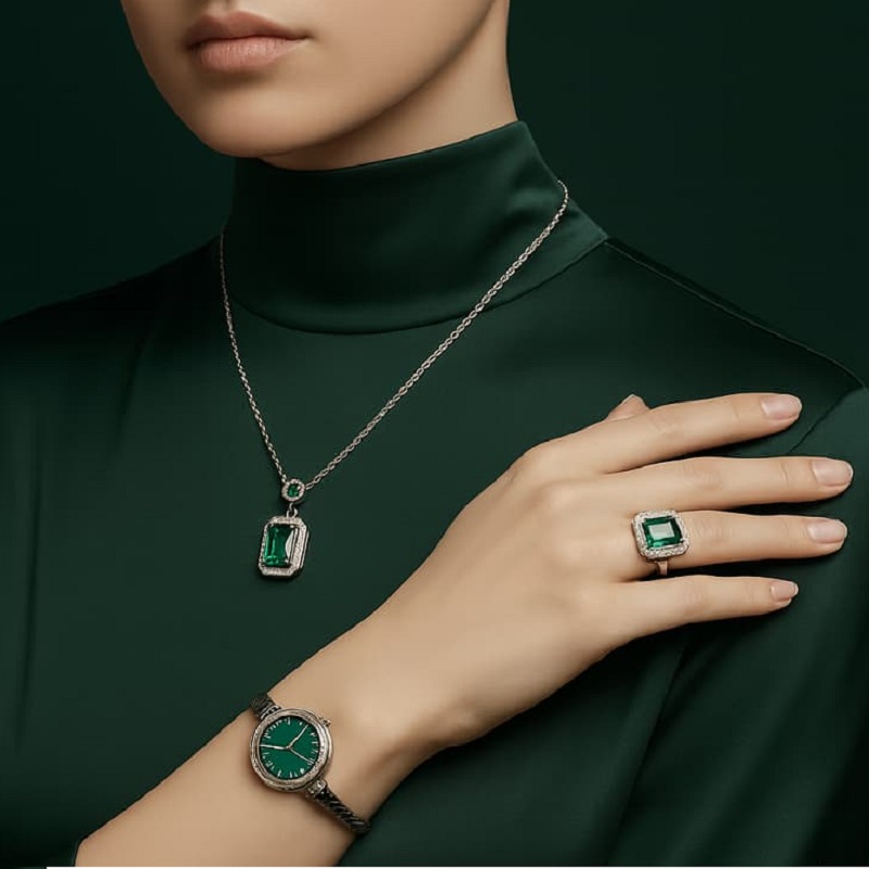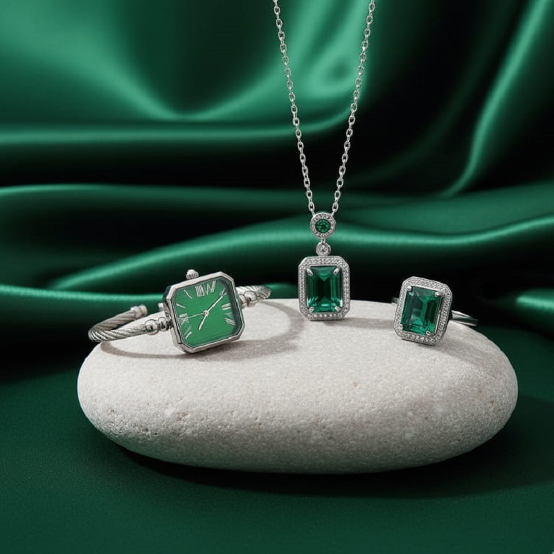 ست زنانه ساعت و گردنبند و انگشتر مدل زمرد-نقره ای
